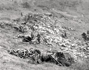 Open and empty boxes litter the ground following a night of heavy shelling from a field-artillery battery, November 1951. PAUL TOMELIN, LIBRARY AND ARCHIVES CANADA—PA188757