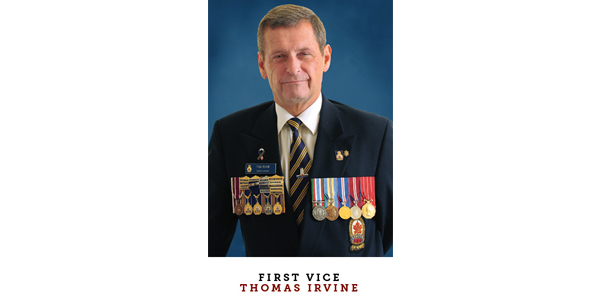 FIRST VICE Thomas Irvine, 61, served for 23 years with the Black Watch (Royal Highland Regiment) of Canada including active duty in Egypt with the United Nations Emergency Force. He has spent 28 years serving the Legion and is currently a life member of Hemmingford, Que., Branch. Irvine rose through the ranks to provincial vice-chairman, vice-president and three terms of provincial chairman. This past summer, he was appointed chairman of the Canvet Publications Ltd. Board of Directors.