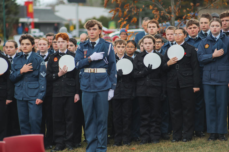 Cadets, veterans, serving personnel and the public, including local Chase Meade gather at the Cenotaph in Oromocto, N.B., on Remembrance Day 2025. [Annie Bowers]