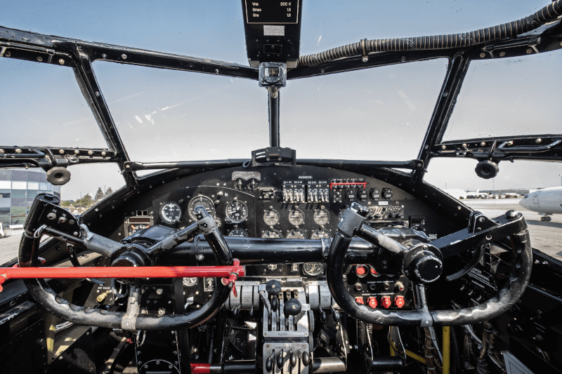 When you move through to the cockpit, depending on your height, you might be able to stand up again. There’s a Perspex canopy that runs up and over your head and out in front of you. You’ll also see the dual-control systems where the pilot and co-pilot sit and operate the aircraft. During the war, there would have only been one pilot due to wartime necessities, but also due to the loss rate of pilots in aircraft of this type, the rationale being that if you’re going to lose a plane, it’s better to lose only one pilot than two.