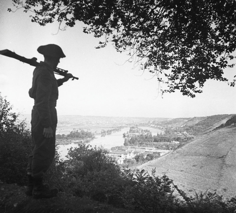 Sergeant B. Shaw looks out over Rouen, France, on Aug. 31, 1944.[Ken Bell/DND/LAC/PA-131223]