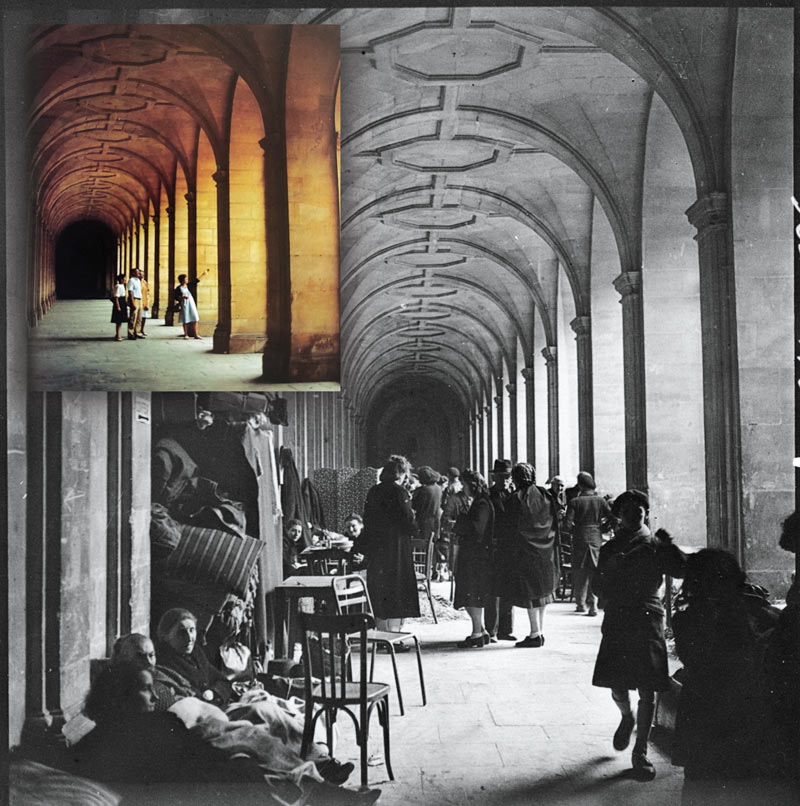Civilians settle in a church in Caen, France, on July 10, 1944. Postwar [inset], tourists explore the site.[Ken Bell/DND/LAC/PA-135905; Ken Bell/The Way We Were]