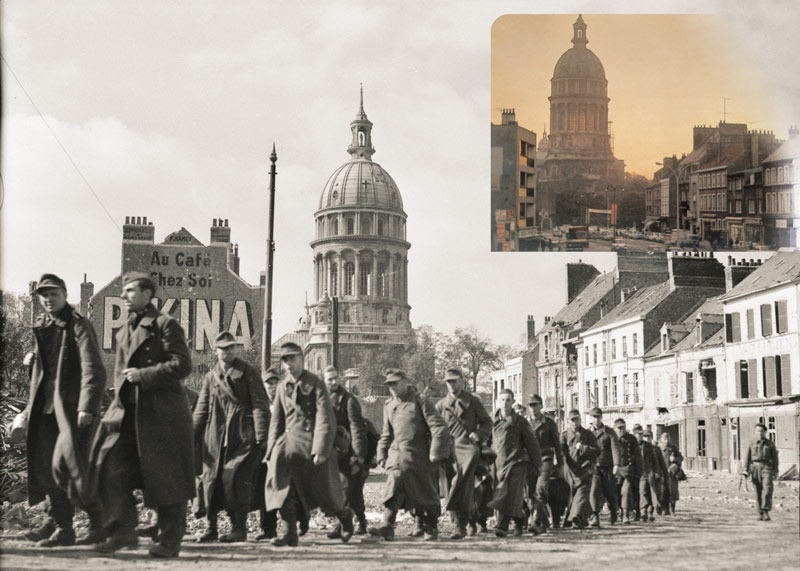 Boulogne-sur-Mer, France, at peace [top], while on Sept. 19, 1944, German prisoners are marched away.[Donald I. Grant/DND/LAC/PA-136333]