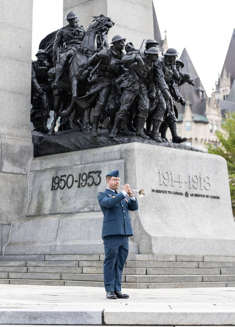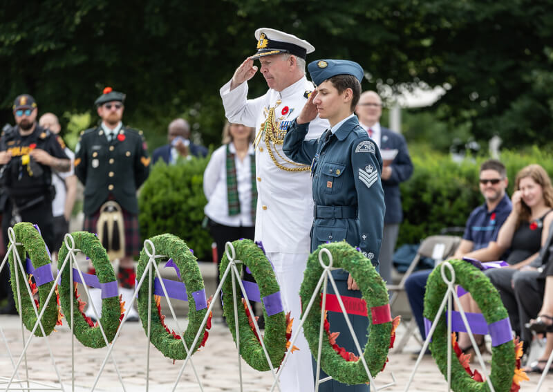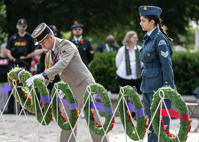 Lieutenant-Colonel Stephan Doerdrechter of Germany, accompanied by Air Cadet Flight Sergeant Kristian Sakamoto, places a wreath at the National War Memorial during ceremonies surrounding the 109th anniversary of Beaumont-Hamel, in which the Newfoundland Regiment was all but wiped out on the first day of the Battle of the Somme. Doerdrechter is wearing a forget-me-not on his left lapel, the Newfoundland and Labrador — and German — flower of remembrance. [Stephen J. Thorne]