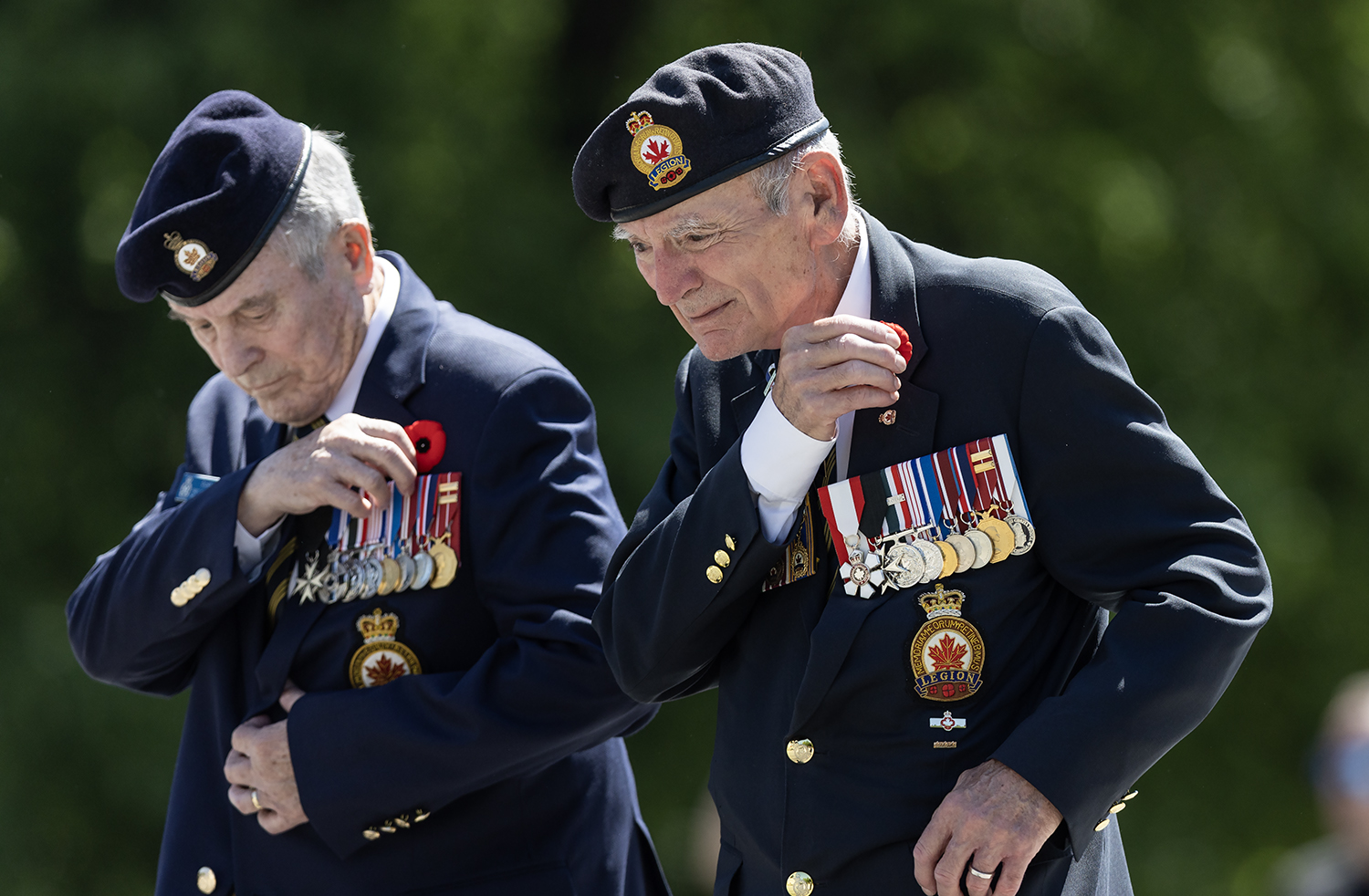 Retired brigadier-general Duane Daly (left) and retired vice-admiral Larry Murray, grand president of The Royal Canadian Legion, remove their poppies to place on the Tomb of the Unknown Soldier. [Stephen J. Thorne/Legion Magazine]