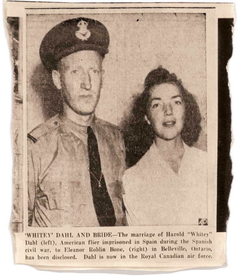 While stationed at RCAF Trenton as a flight instructor, Whitey Dahl married Eleanor Bone, revealing his first marriage had been a sham. [Toronto Telegram August 1941]