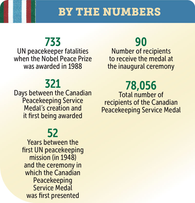 It is the considered opinion of the Committee,” declared the presenters of the 1988 Nobel Peace Prize, “that the [recipient] Peacekeeping Forces through their efforts have made important contributions towards the realization of one of the fundamental tenets of the United Nations.” In bestowing the prestigious accolade on all blue beret wearers, Canadian or otherwise, more than 40 years of service—and the sacrifices of at least 733 lives—had finally been recognized.