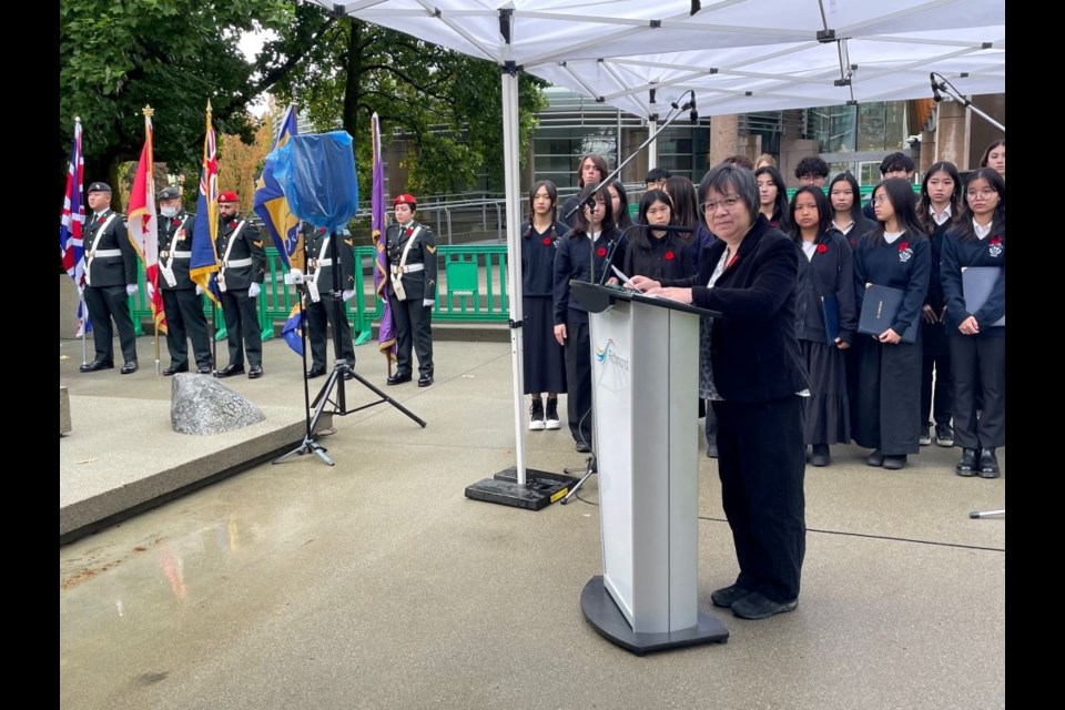 Historian Debbie Jiang speaks at the rededication ceremony of the Richmond, B.C., cenotaph on Oct. 4, 2024. [Courtesy Debbie Jiang]
