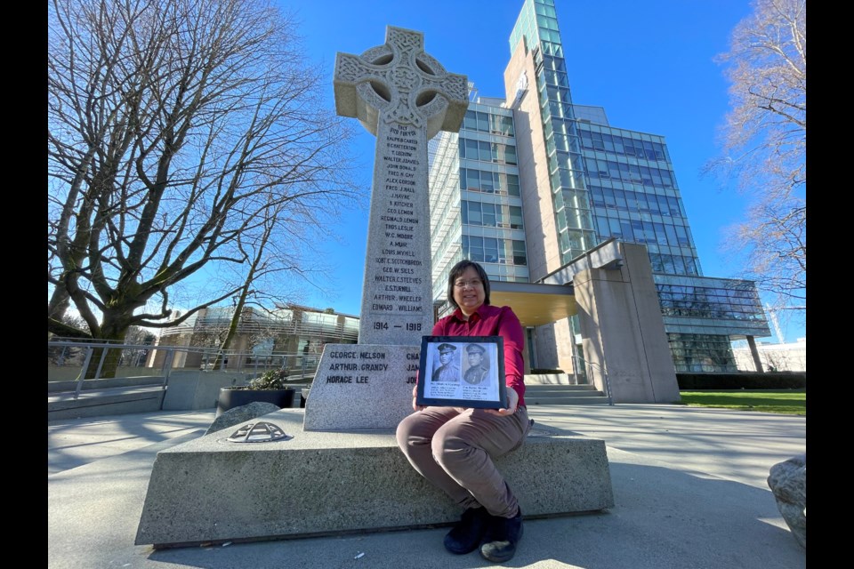 Historian Debbie Jiang poses with photos of Japanese-Canadian WW I veterans Hikotaro Koyanagi and Kazuo Harada whose names were added to the cenotaph in Richmond, B.C., in October 2024. [Courtesy Debbie Jiang]