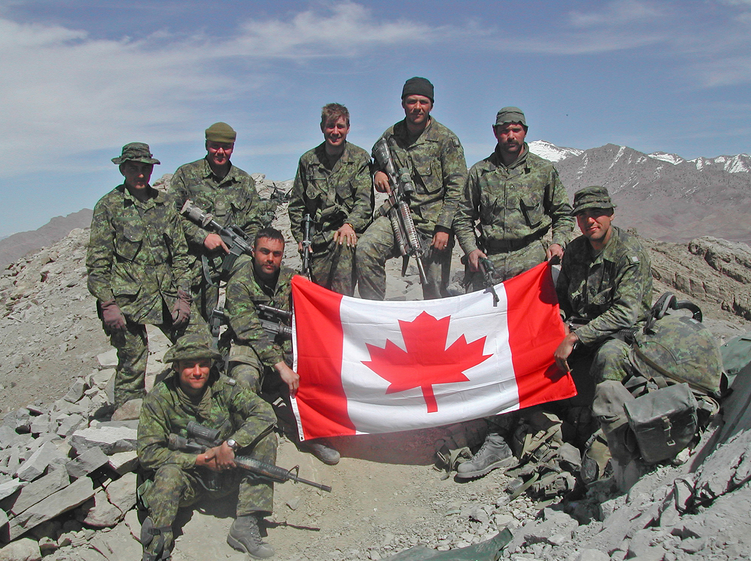 Members of the 3rd Battalion, Princess Patricia’s Canadian Light Infantry reconnaissance platoon following a firefight on the Whale’s Back near the Afghanistan-Pakistan border on March 14, 2002. From left rear: Pte. Shaun Cameron, from Duck Lake, Sask.; Cpl. Erik Kuerr of Edmonton; Sgt. Torry White; MCpl. Vic Mover of Thunder Bay, Ont.; and MCpl. Chuck Cote of Edmonton. In front are Pte. Francis McCann of Langley, B.C.; Capt. Ryan Latinovich of Welland, Ont., and MCpl. Jeff Whibbs of Peterborough, Ont.