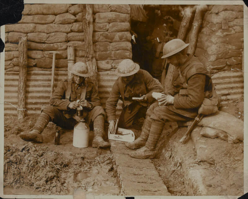 British or Commonwealth soldiers eating in a trench with their rum ration in a stone jug, 1917. [NAM/2002-02-589-7]