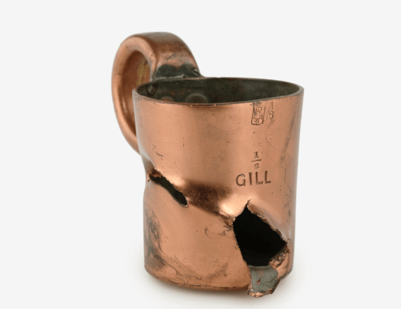 A half-gill measure for the rum ration on HMS Vindictive. The measuring cup was damaged by gunfire during the action at Zeebrugge in April 1918. [IWM/EPH 5235]