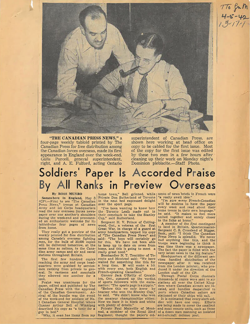Munro’s account is topped by a picture of A.E. Fulford and Gillis Purcell putting the first edition of The Canadian Press News together in the wee hours of April 27, 1942 after the national plebiscite on compulsory military service.