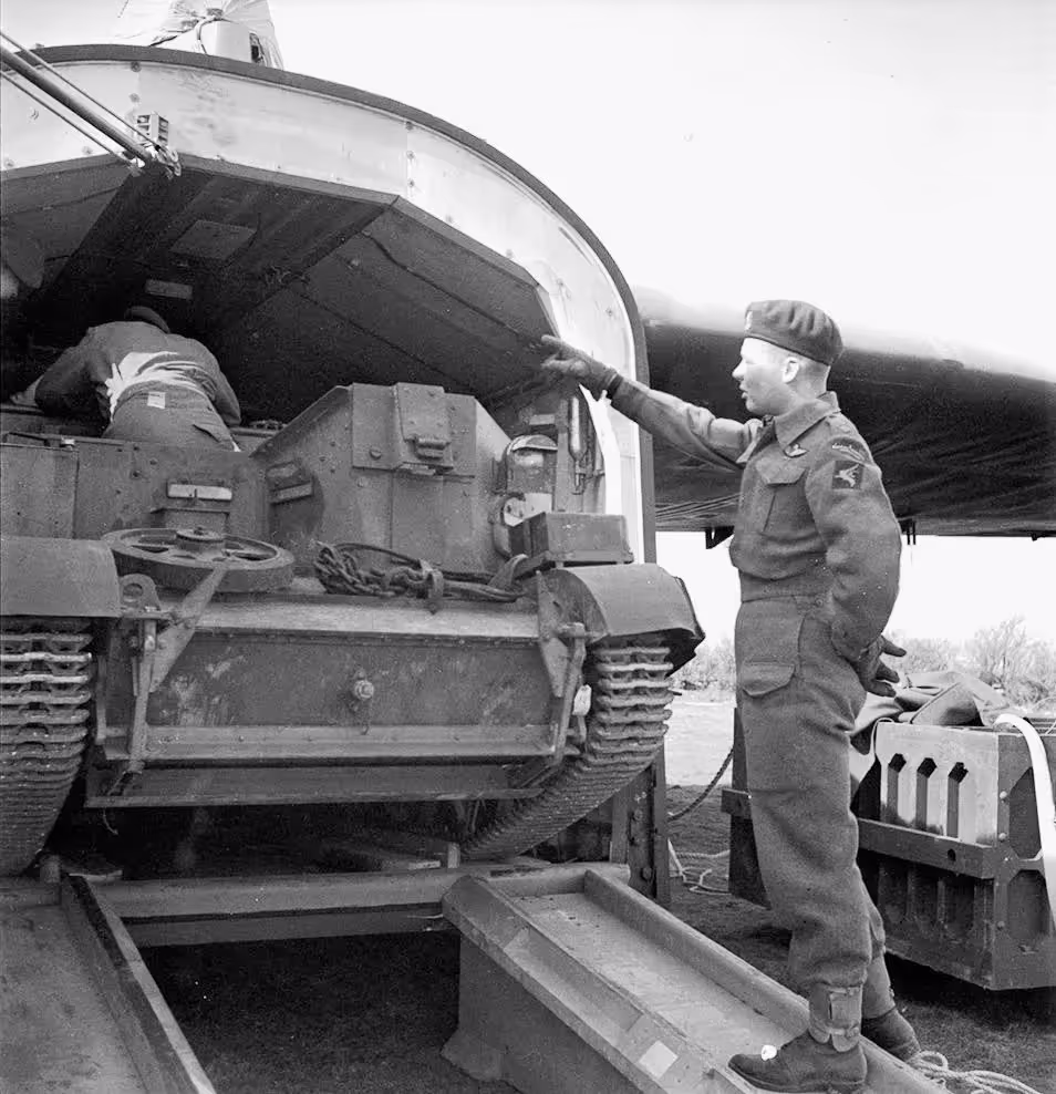 Lieutenant John Madden of 1st Canadian Parachute Battalion helps load a Universal Carrier into a Royal Air Force glider in preparation for an operation in March 1945. On D-Day, Madden commanded a group of Canadian paratroopers that landed in the Sword Beach sector. [LAC/3524473]