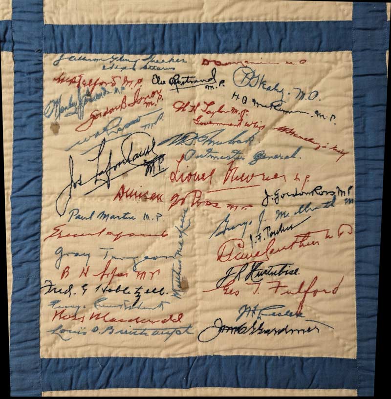 Margaret Eaton Bishop, wife of Canadian airman and Great War Victoria Cross recipient Billy Bishop, found a different way to galvanize quilt makers. Though a venture replicated elsewhere, she capitalized on her husband’s transatlantic travel plans by having him collect signatures to later embroider into a fundraising quilt.