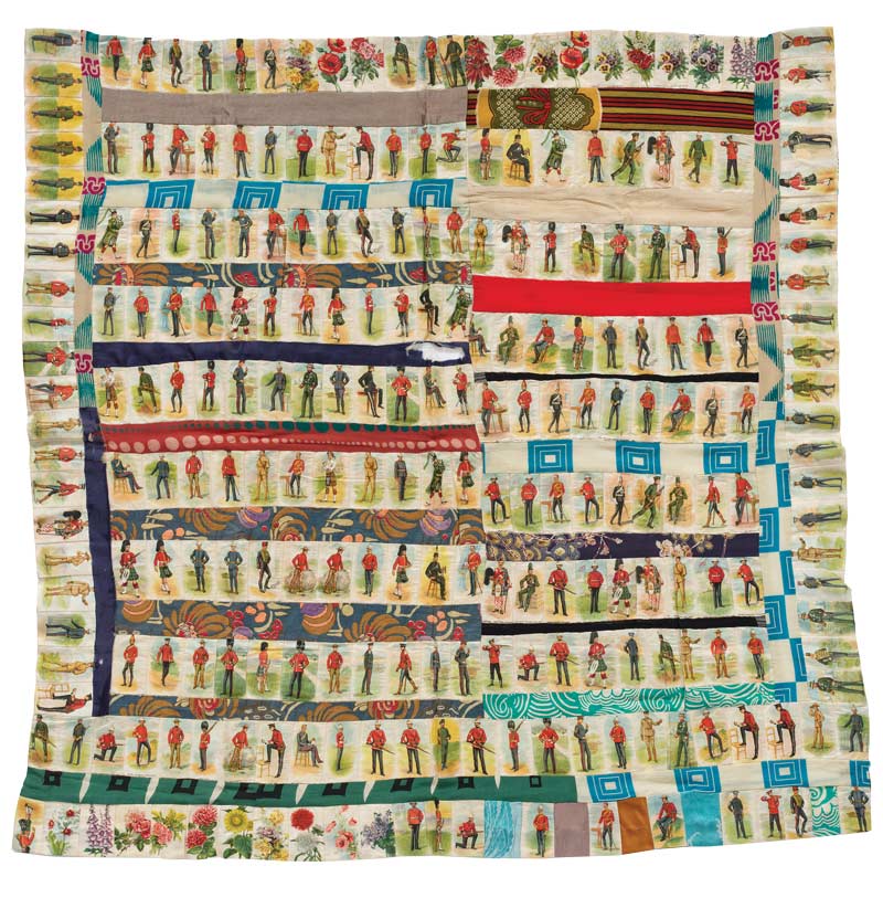 The bulk of Murakami’s block design comprises 247 so-called silks from cigarette packets, a corporate marketing strategy that attempted to promote smoking among women. Technically made from cotton and silk blend patches, 225 of these inserts depict Canadian regimental uniforms, unintentionally imbuing the quilt top with irony that perhaps wasn’t lost on its maker. The remainder of the spread includes fragments of Japanese kimonos, a testament to resilience during one of Canada’s darkest chapters. Murakami’s quilt is in the collection of the Royal Ontario Museum in Toronto.