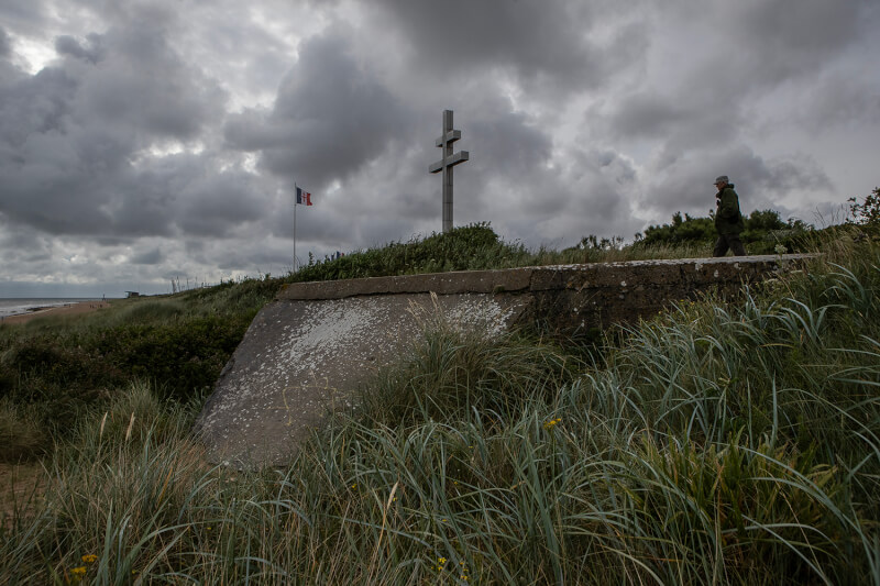 The Cross of Lorraine monument on Juno Beach commemorates General Charles de Gaulle’s return to France after years of exile during WW II. He landed between Graye-sur-Mer and Courseulles-sur-Mer, on June 14, 1944, eight days after D-Day. The 18-metre tall stainless steel structure, was erected at the boundary between the two towns. The Cross of Lorraine became a symbol of national independence and symbol of rallying in both victory and defeat. The Free French Forces adopted it in July 1940 in answer to the Nazi swastika. It was later taken on throughout Free France and appeared on many insignia and monuments. [Stephen J. Thorne/LM]