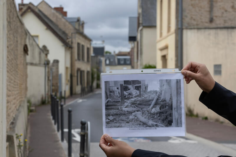 A building in Cintheaux, France, near the spot where German tank ace Michael Wittman was killed, still bears the scars of the fighting in Normandy 81 years ago. [Stephen J. Thorne/LM]