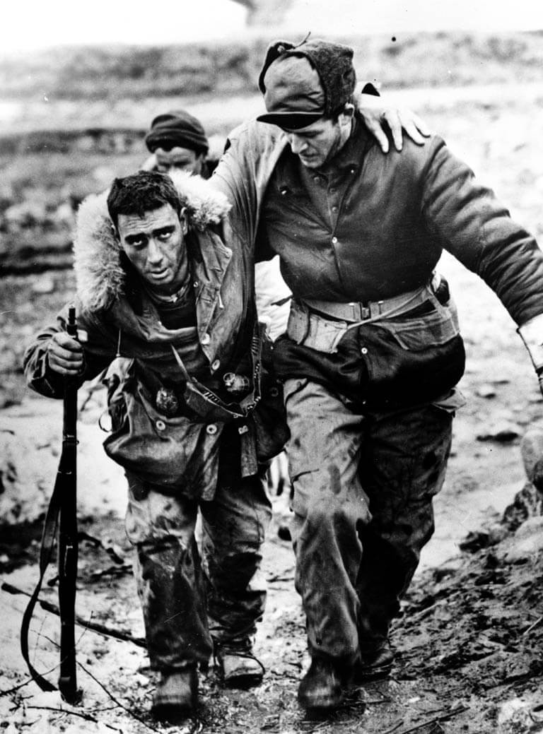 Canadian rifleman Private Morris J. Piche of the 2nd Battalion, Princess Patricia’s Canadian Light Infantry, is helped to an aid station behind the Korean front lines by Lance Corporal W. J. Chrysler during the Battle of Kapyong in April 1951. [Imperial War Museum/KOR 652]