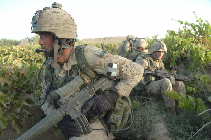 Canadian soldiers pause in a grape vineyard during Operation Medusa, part of the September 2006 Battle of Panjwaii in Kandahar, Afghanistan.