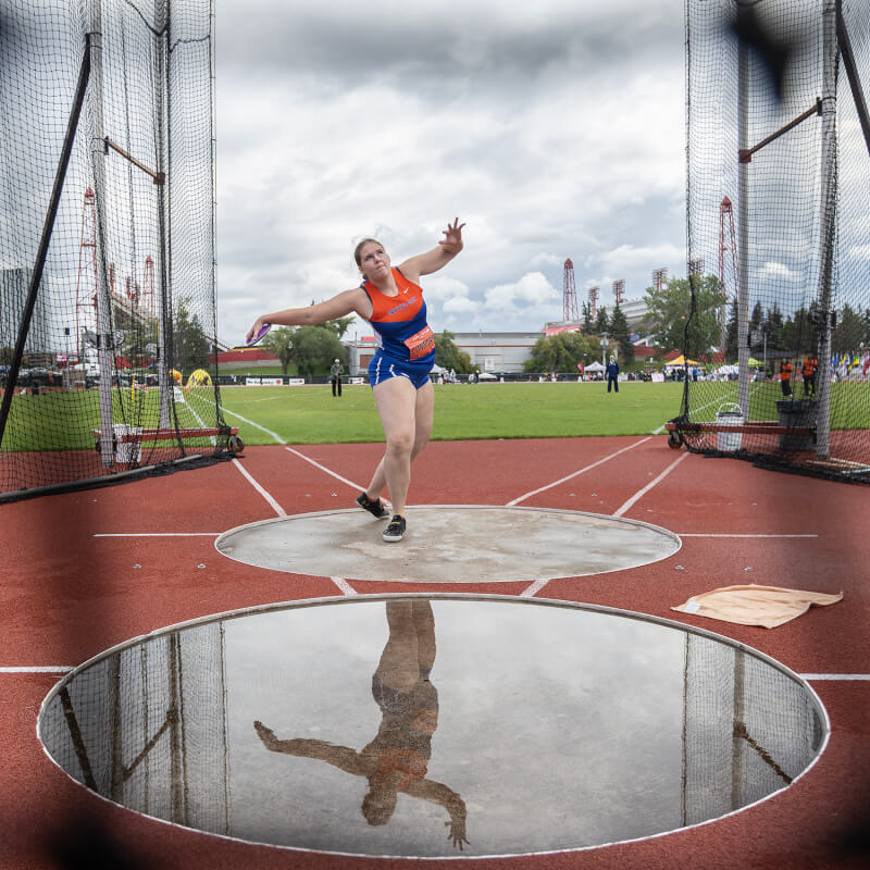 Sabriel Connors of Capital City Track Club in Edmonton winds up for a U-18 women’s discus throw. [Stephen J. Thorne/LM]