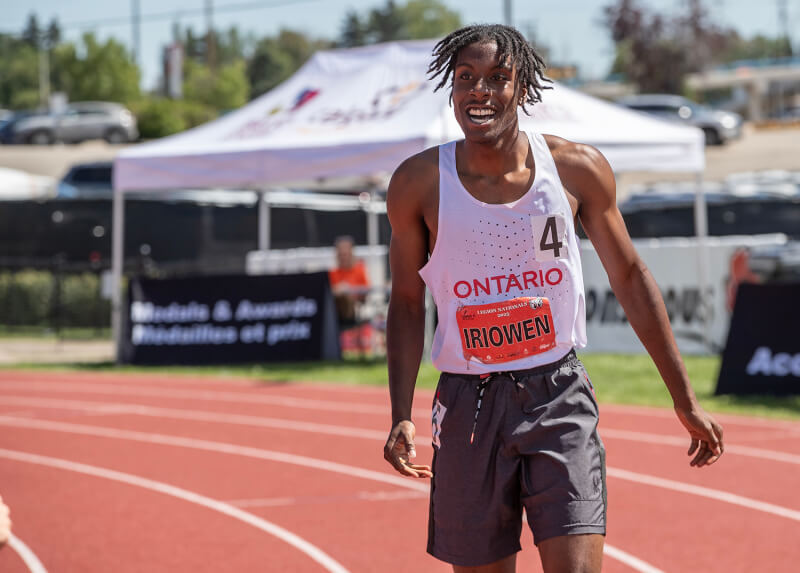 Clearly up, Dennis Iriowen of Ontario received the Jack Stenhouse Award as top male Legion athlete after setting a national record of 20.84s in the U-18 men’s 200m. He also took gold in the 100m with a time of 10.35s. [Stephen J. Thorne/LM]