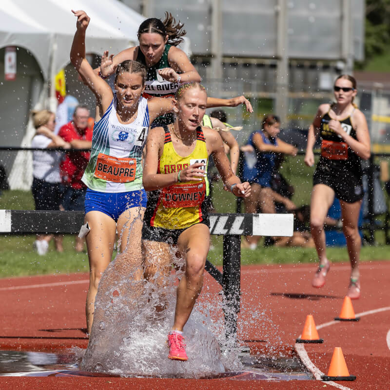 Marcus Yu of Newmarket, Ont., Huskies Track Club heads for the water in the U-18 men’s 2,000m steeplechase. [Stephen J. Thorne/LM]