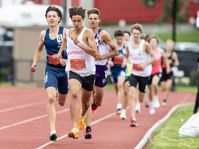 James Grant of Sarnia, Ont., Athletics overcame teammate Chase Capes to win the U-18 men’s 1,500m race by more than 1s, in 3:57.39. Capes finished second, while Riley Simmonds of B.C./Yukon took the bronze. [Stephen J. Thorne/LM]