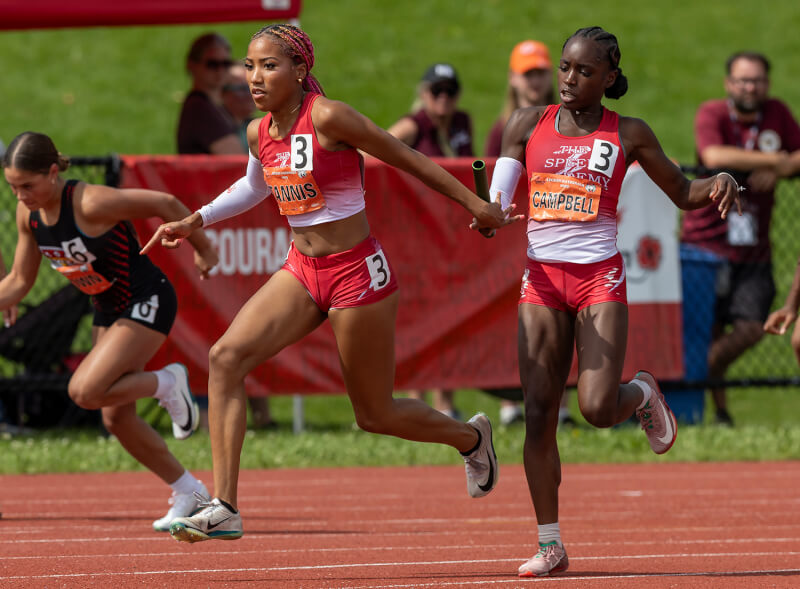 Sanaa Chesney of Thorhold, Ont., Elite Track CLub hands-off to teammate Koko Dennis after running the first leg of the 1,600m medley relay. The team finished fifth. [Stephen J. Thorne/LM]