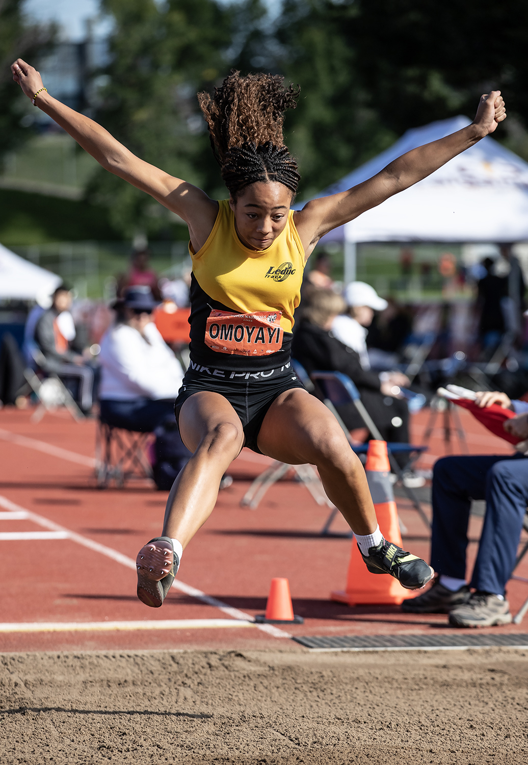 Fly like an eagle. Abiola Omoyayi of Leduc, Alta., Track Club took bronze in the U-18 women’s heptathlon with 4,528 points. [Stephen J. Thorne/LM]