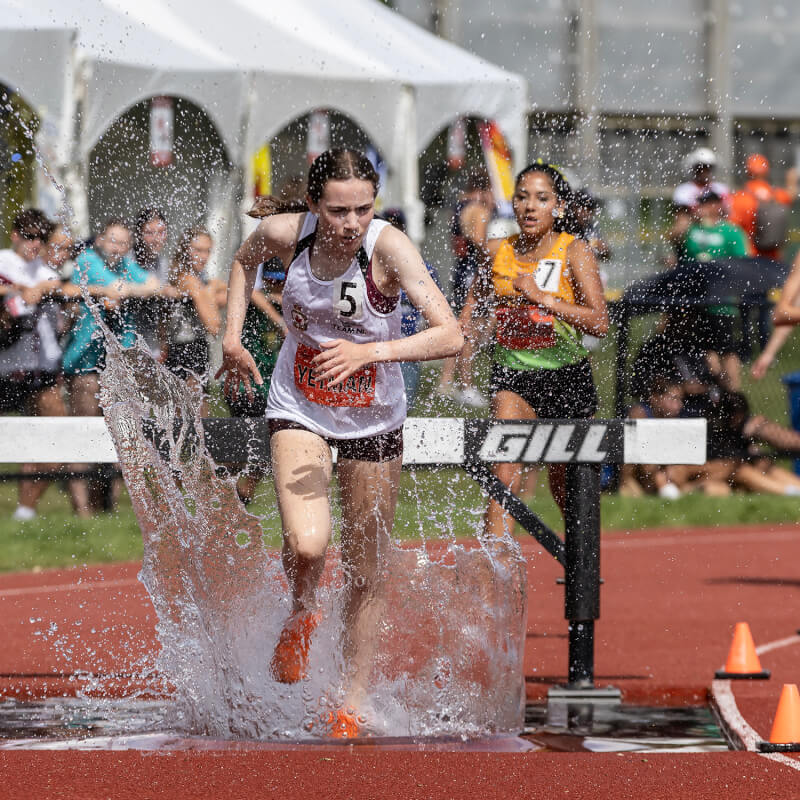 Noelle Pols of Calgary’s Caltaf Athletics clears the final obstacle in the U-16 women’s 1,500m steeplechase. [Stephen J. Thorne/LM]