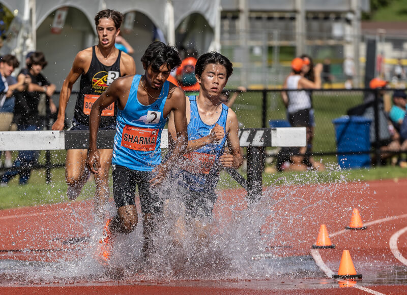 Nishant Sharma of Calgary Spartans TFC and Daniel Zhang of Ocean Athletics in Surrey, B.C., tackle the water hazard in the U-18 men’s 2,000m steeplechase. [Stephen J. Thorne/LM]