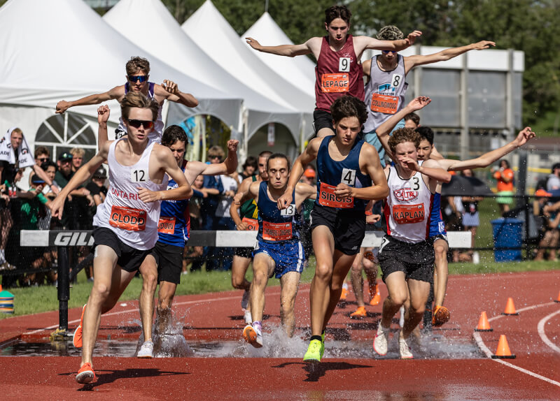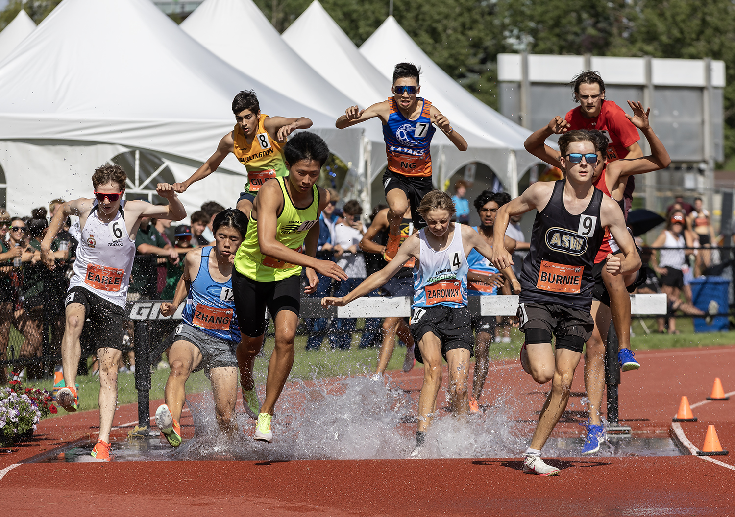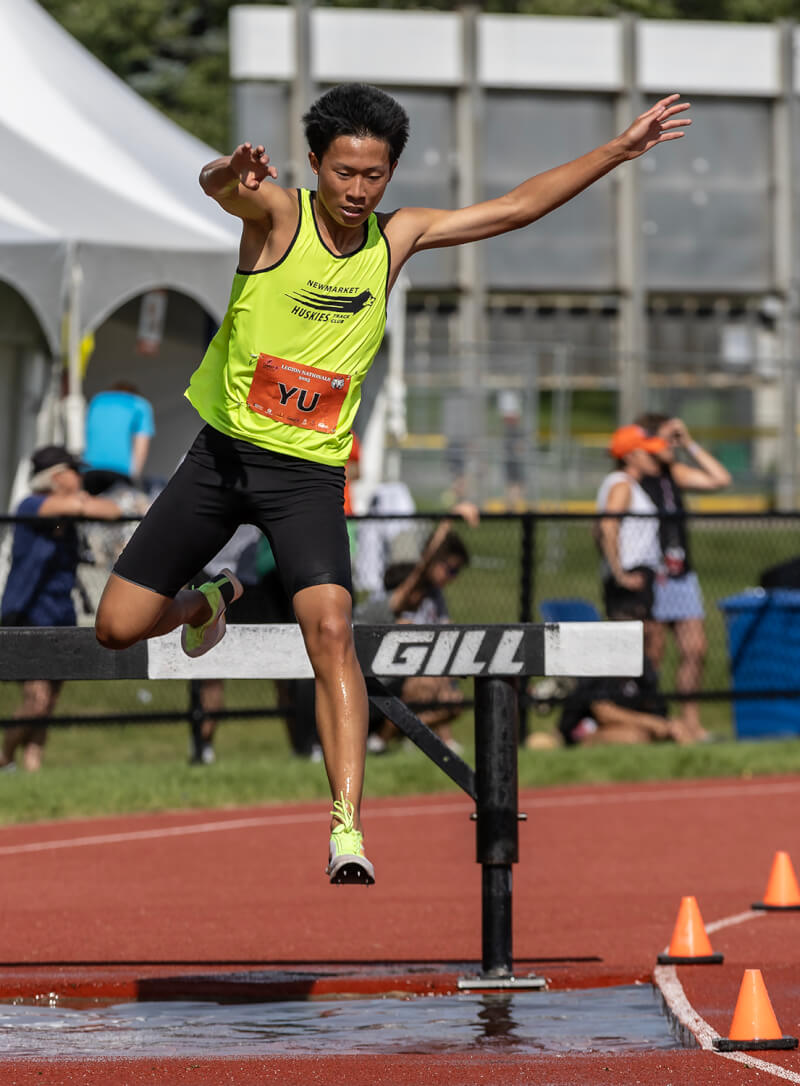 Marcus Yu of Newmarket, Ont., Huskies Track Club heads for the water in the U-18 men’s 2,000m steeplechase. [Stephen J. Thorne/LM]