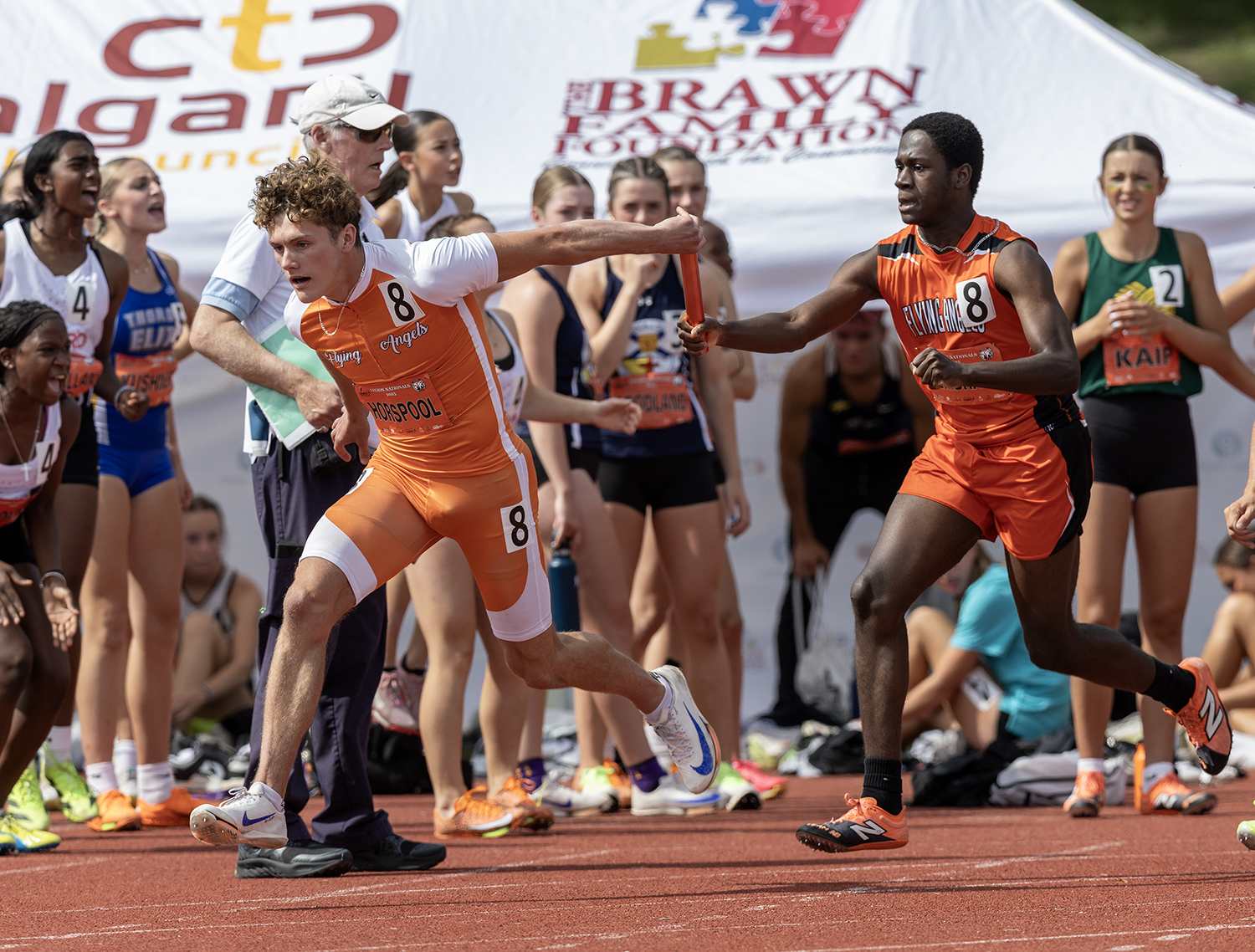 Flying Angels anchor Noah Horspool is in full stride as he takes the final pass in the U-18 men’s 4x100m from Kula Nembhard Jr. en route to a gold medal to go with his two silvers (100m and 200m). Lead Eamon Sheppard and second Jahleel Haley opened for the winning foursome. [Stephen J. Thorne/LM}
