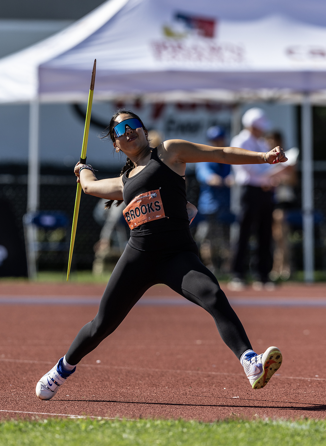 Eleyna Brooks of Truro, N.S., Lions Track and Field heaves one in the U-18 women’s javelin. [Stephen J. Thorne/LM]