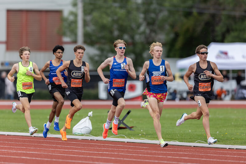Decathlete Sullivan Friesen of the Langley, B.C., Mustangs grabs a gulp of oxygen after finishing second in the 1,500m run. He finished the competition 8th in a field of 14, recording 5,035 points. [Stephen J. Thorne/LM]