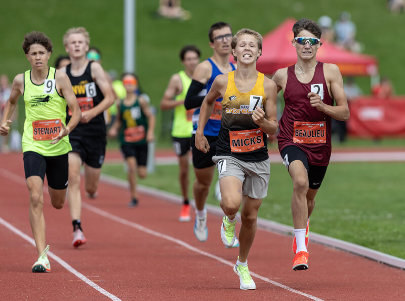 Liam Micks of Stratford, Ont., Sabrecats Track Club edged Samuel Beaulieu of New Brunswick with a time of 2:04.96 to take gold in the U-16 men’s 800m, while Tyler Stewart of Newmarket, Ont., Huskies Track Club earned bronze. [Stephen J. Thorne/LM]
