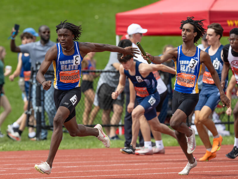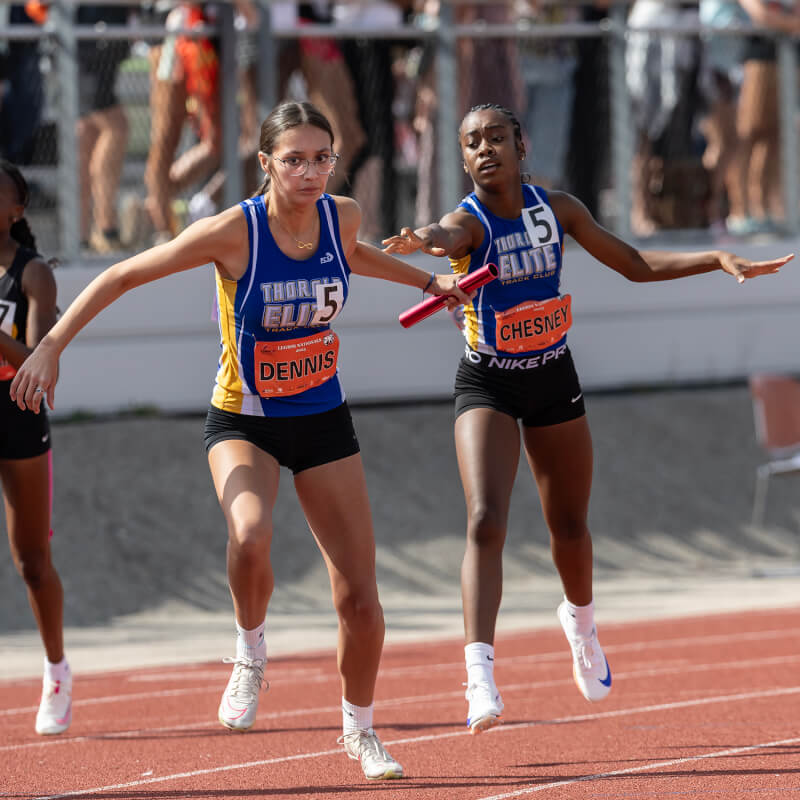 Sanaa Chesney of Thorhold, Ont., Elite Track CLub hands-off to teammate Koko Dennis after running the first leg of the 1,600m medley relay. The team finished fifth. [Stephen J. Thorne/LM]