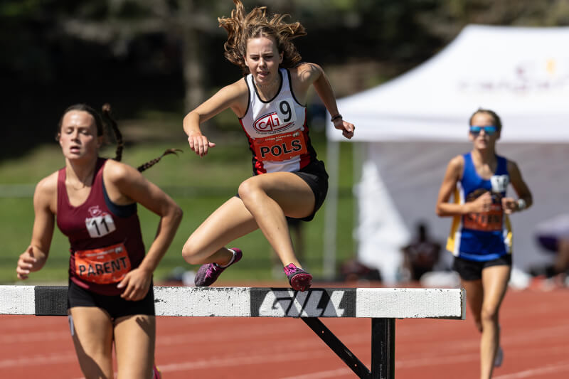 Noelle Pols of Calgary’s Caltaf Athletics clears the final obstacle in the U-16 women’s 1,500m steeplechase. [Stephen J. Thorne/LM]