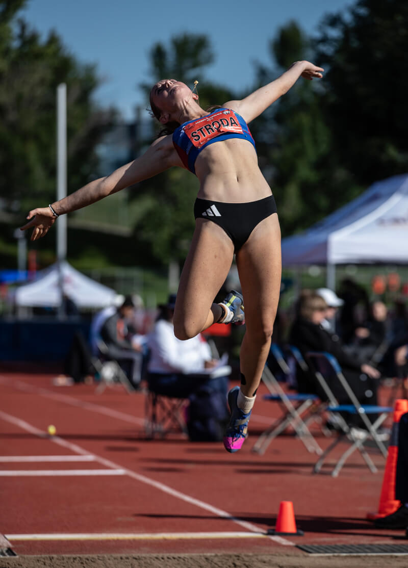 Lily Stroda of B.C./Yukon smashed a 10-year-old national pentathlon record, scoring 5,573 points and winning the LeRoy Washburn Award as top female Legion athlete. She leapt a 5.91m in the long jump, one of the five heptathlon events she won. [Stephen J. Thorne/LM]