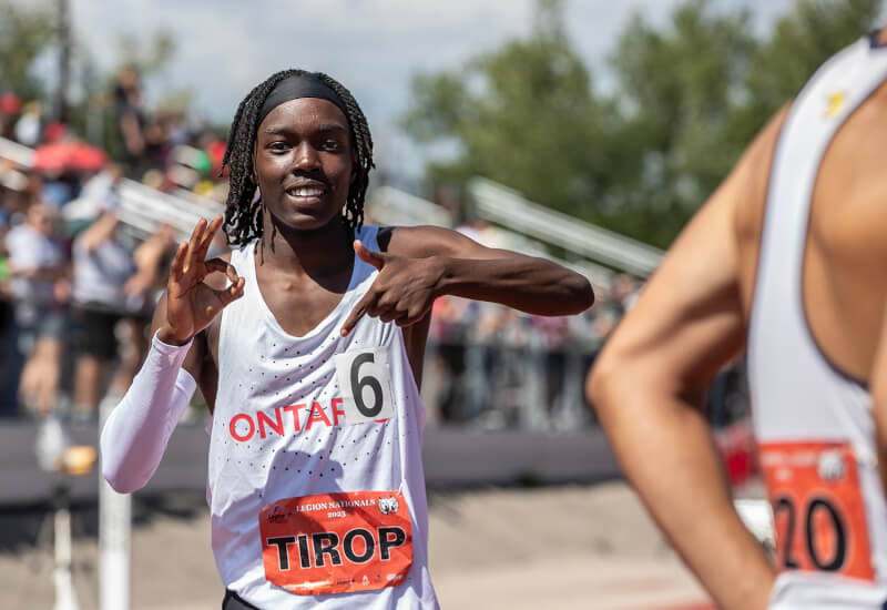 James Grant of Sarnia, Ont., Athletics overcame teammate Chase Capes to win the U-18 men’s 1,500m race by more than 1s, in 3:57.39. Capes finished second, while Riley Simmonds of B.C./Yukon took the bronze. [Stephen J. Thorne/LM]