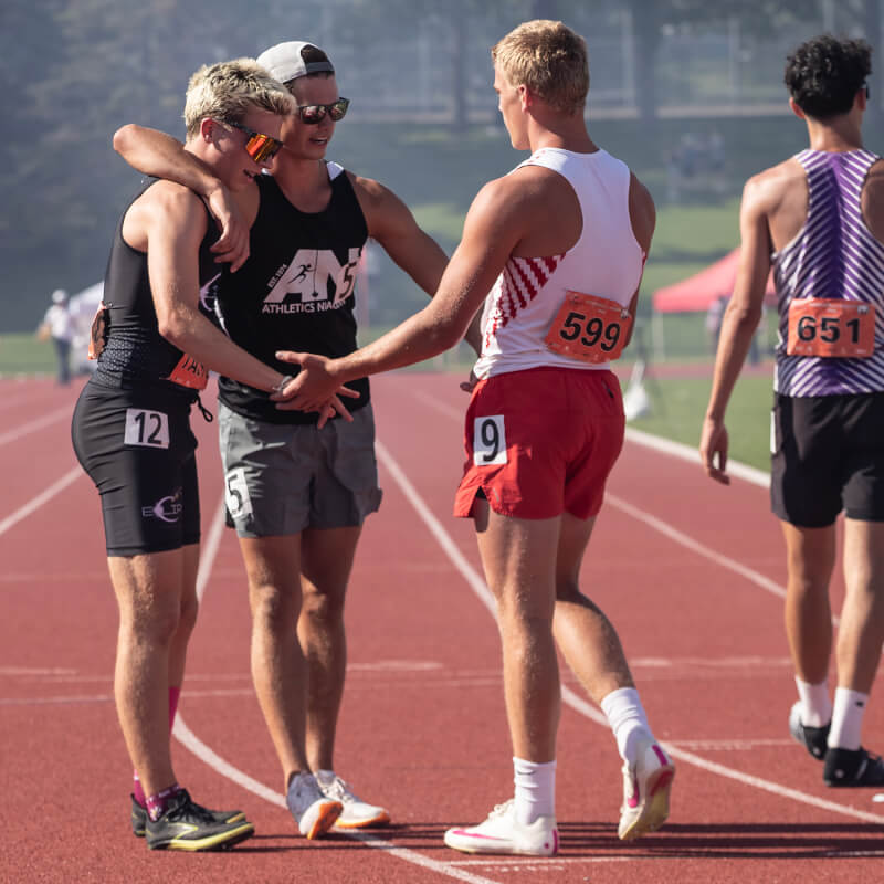 Congratulations all around as the U-18 men’s pole vault teammates finish 1-2. [Stephen J. Thorne/LM]