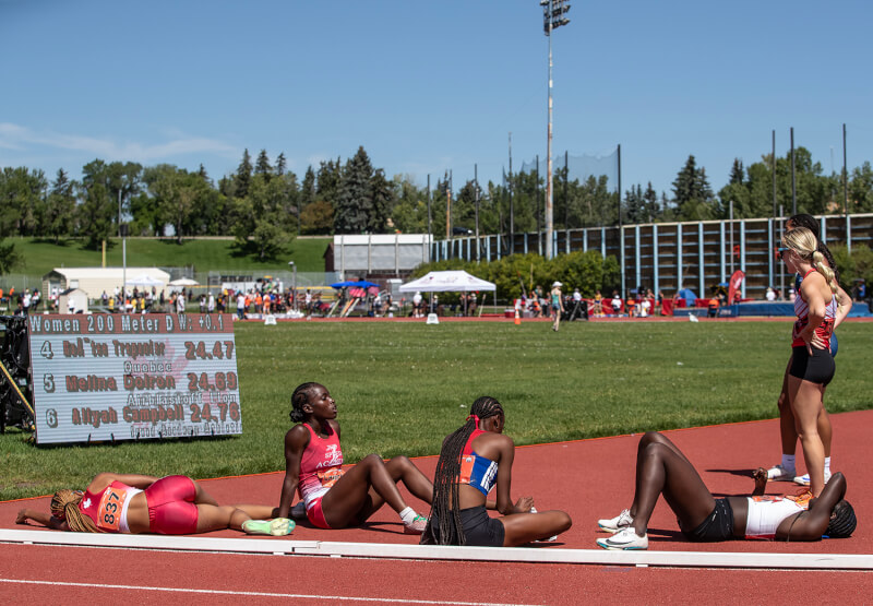 U-18 decathletes recover as more come in to finish the 1,500m. Smoke hangs over the track from a Calgary Stampeders game next door. [Stephen J. Thorne/LM]