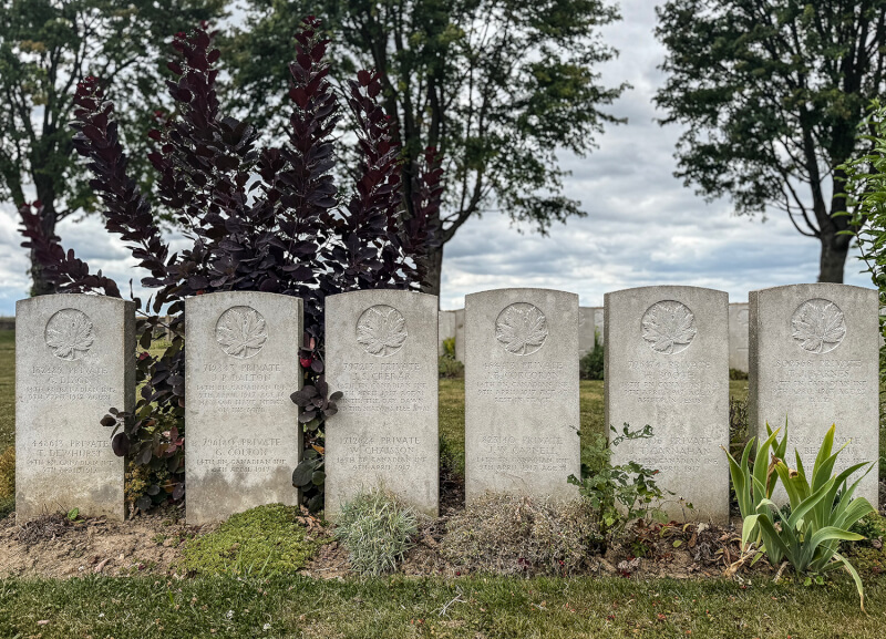 When units collected their dead and couldn’t tell two of them apart, they buried them together. Here, 12 members of the 14th Battalion (Royal Montreal Regiment) are buried in six plots at Nine Elms Military Cemetery. All were killed at Vimy Ridge on April 9, 1917. [Stephen J. Thorne/LM]