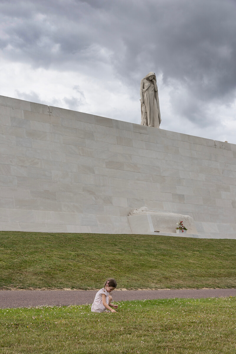The Canada Bereft statue watches over a young French girl picking clover at the base of the Canadian National Vimy Memorial. [Stephen J. Thorne/LM]